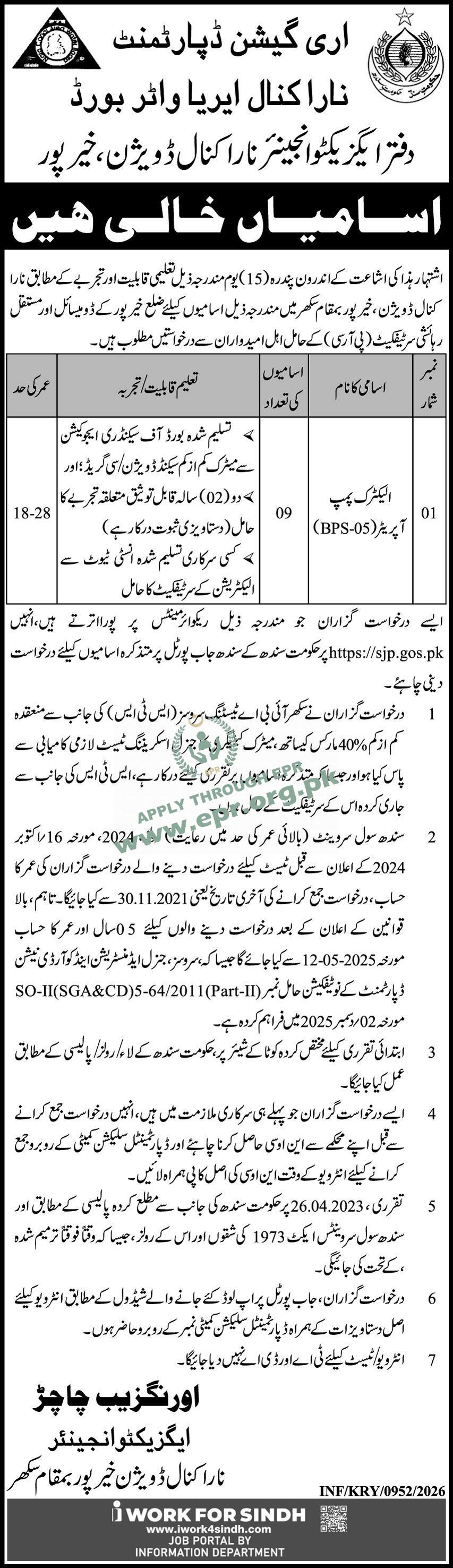 The job is announced by the Sindh Irrigation Department.